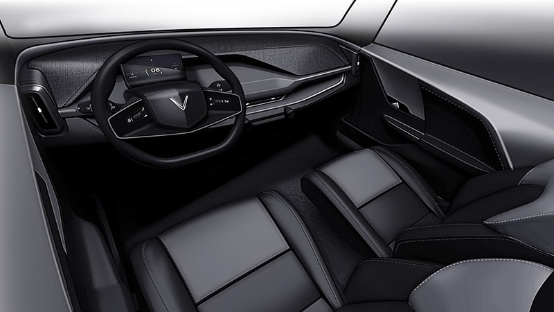 VF3 được thiết kế không gian nội thất khá hiện đại, và hướng đến sự sang trọng với các chi tiết đường chỉ khâu ở mặt táp lô và các vị trí ốp hai bên cánh cửa và vô lăng thường xuất hiện ở các dòng xe sang (Có thể VinFast sẽ dùng vật liệu nhựa nhưng giả vân chỉ để tạo sự sang trọng mà vẫn đảm bảo không làm tăng giá thành sản phẩm). Phần taplo chiếm diện tích không quá lớn do đó chúng ta có thể thấy không gian nội thất ở ghế lái và ghế phụ khá rộng rãi.